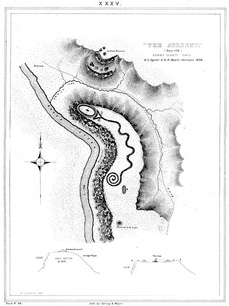 The Great Serpent Mound is a 1,330-foot-long, three-foot-high prehistoric effigy mound located on a plateau of the Serpent Mound crater along Ohio Brush Creek in Adams County, Ohio. Maintained within a park by the Ohio Historical Society, it has been designated a National Historic Landmark by the United States Department of Interior. The SerpentMound of Ohio was first reported from surveys by Ephraim Squire and Edwin Davis in their historic volume Ancient Monuments of the Mississippi Valley published in 1848 by the newly founded Smithsonian Museum. The head of the serpent is aligned to the summer solstice sunset and it is thought that the coils may also point to the winter solstice sunrise and the equinox sunrise.